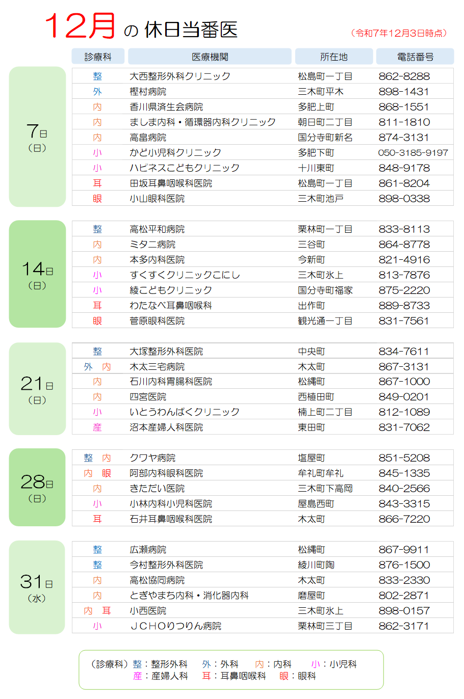 また、当日の新聞(朝刊)、広報高松及び医療情報ネット(ナビイ)でも、当番医の所在地や電話番号等をご確認いただけます。