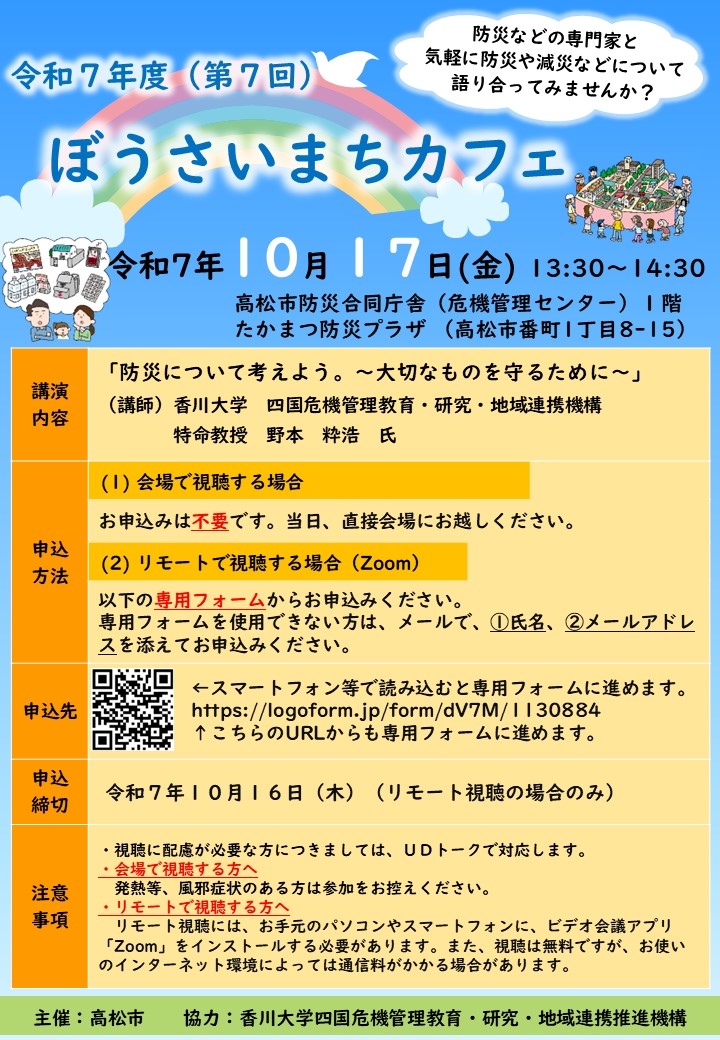 高松市では、概ね月に1回、防災などの専門家をお招きし、どなたでも御参加いただける講演会「ぼうさいまちカフェ」を開催しています。地震や台風などの自然災害について、ちょっとしたことを知ることでも、自分の身を守り、被害を小さくすることができます。ぜひお気軽にお越しください。