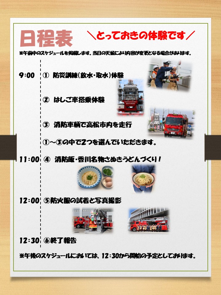 日常ではなかなか体験できない「ドキドキのはしご車、搭乗体験🚒」、「水しぶき全開!放水・取水体験💦」、「消防車に乗って高松市内を走行、冒険気分を味わおう🚗」、「高松さぬきといえば、消防めし、うどんを食べよう😋」など実際に消防士の仕事を体験していただきます。