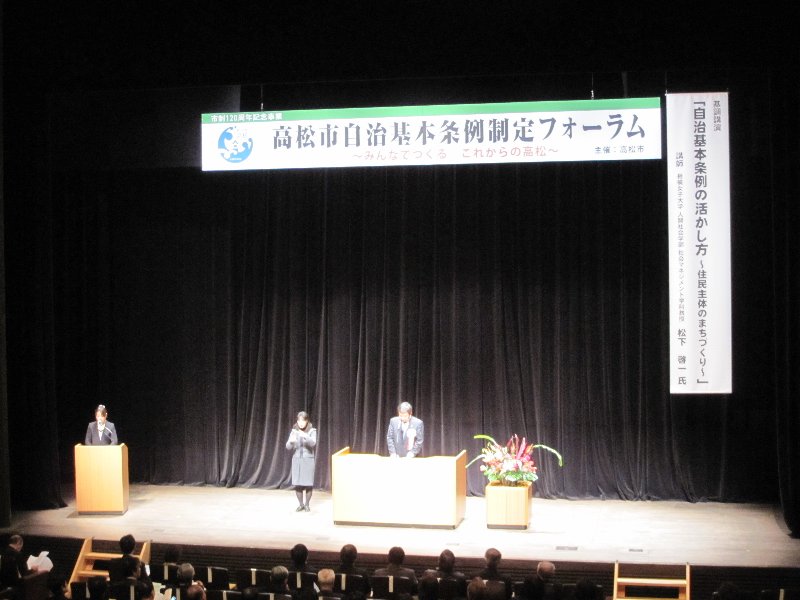自治の基本理念や自治運営の基本原則など、市民、議会、行政(執行機関)が協力して、市民主体のまちづくりを進めていくための基本的なルールを定めた「高松市自治基本条例」が、市制施行120周年記念日の平成22年2月15日に施行しました。この記念すべき日に、自治基本条例を基に、これからのまちづくりについて、市民の皆様とともに考える場として、フォーラムを開催しました。